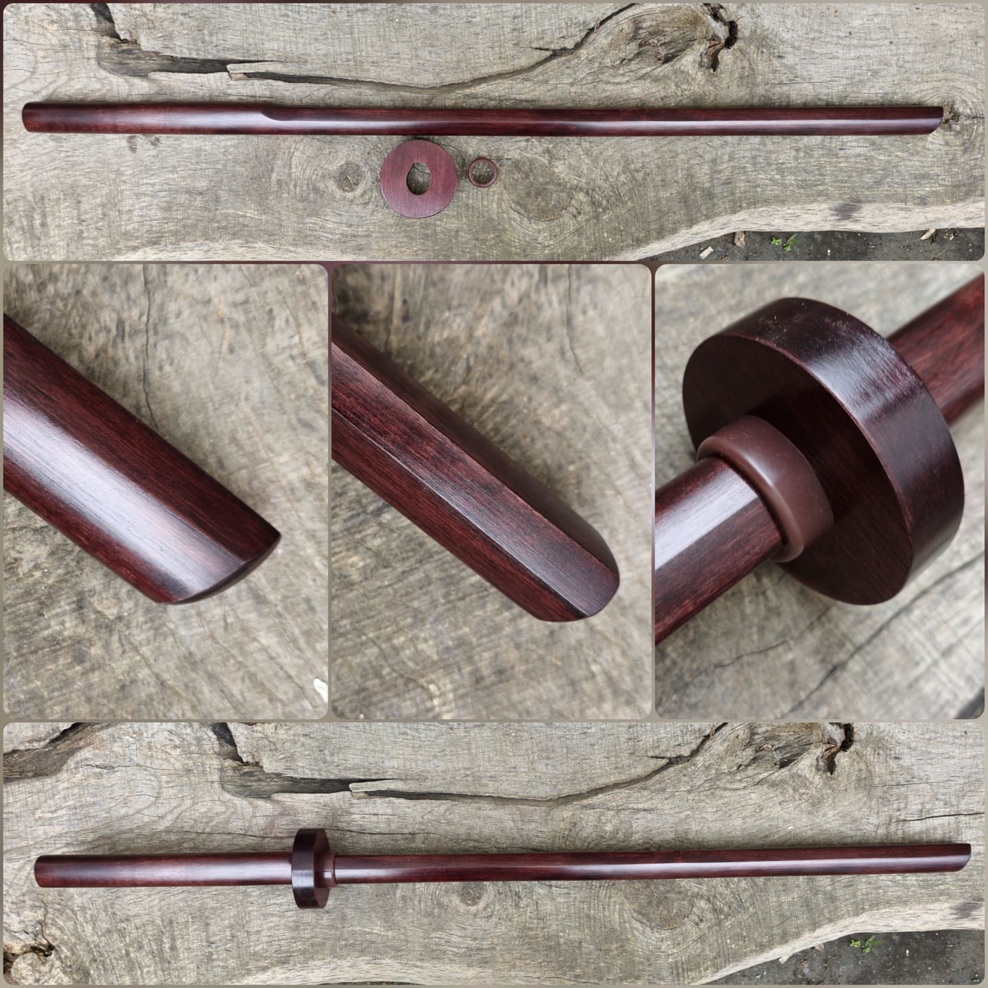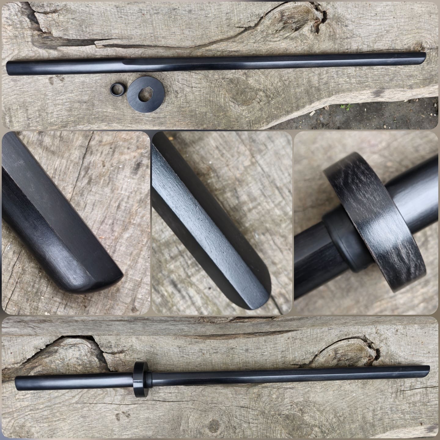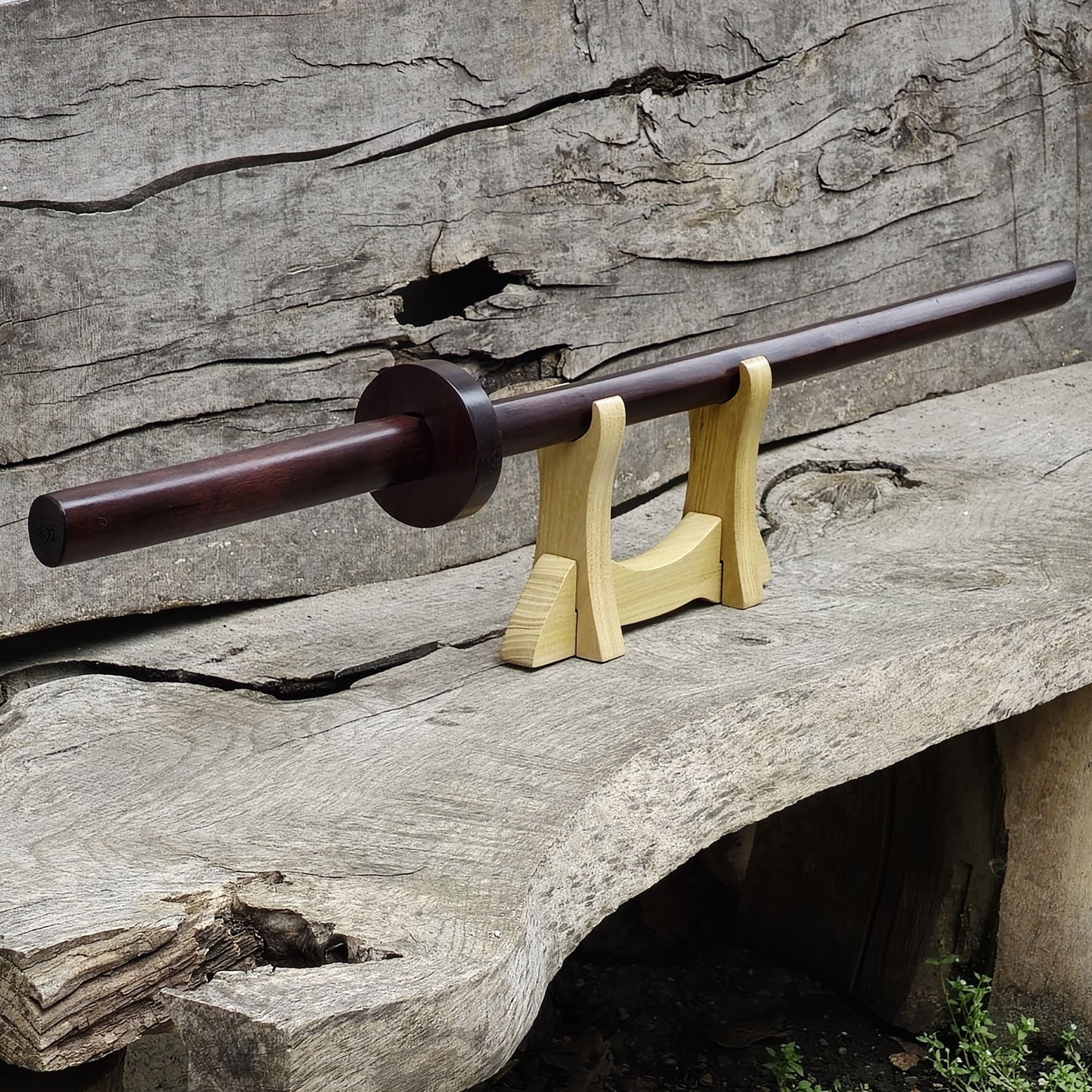 ** The brown and black bokken is treated with a special multilayer brown and black impregnation and oil.